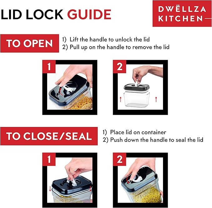 - Enjoy Your Meal With Fresh Food: Keep your foods fresh with our very easy to use airtight lid-lock seal mechanism. No dealing with flimsy pumps. Our food containers create an airtight seal by simply pushing down the ring on the lid. Lift the ring and push up whenever you want to open the containers. The airtight seal is so secure you can store liquids without ever worrying about leaks!