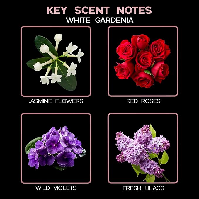 - WHITE GARDENIA – blooming Gardenia, Jasmine Flowers, Red Roses, Wild Violets, and Tuberose; presented in our Signature Apothecary Diffuser with a white ribbon accent and delicate white daisy botanicals; timeless for ivory and pearl décor.
