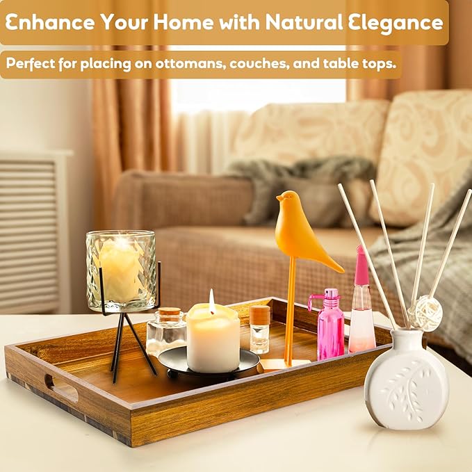 YOUEON 2 Pack Large Acacia Wood Serving Tray with Handles, 17x12 Inch Decorative Wood Trays for Serving Food, Party, Rectangle Ottoman Tray, Coffee Table Trays for Bed, Living Room, Kitchen