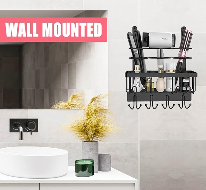 - SPACE SAVING : 3 compartments provide the perfect solution to store your hairdryer, curling iron, flat iron, combs, and brushes. A large basket helps to collect your other styling tools or bath supplies.8 hooks below can as towel hook and coats hook. Get rid of the clutter on the countertops!