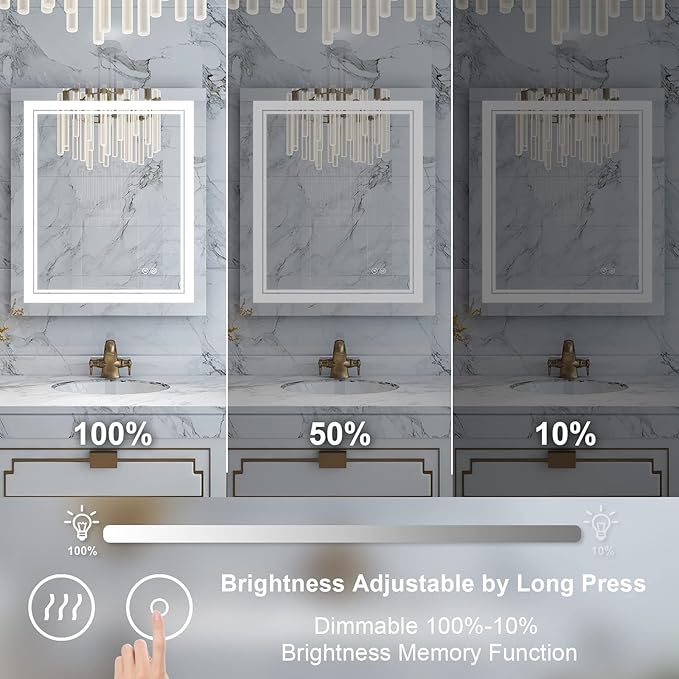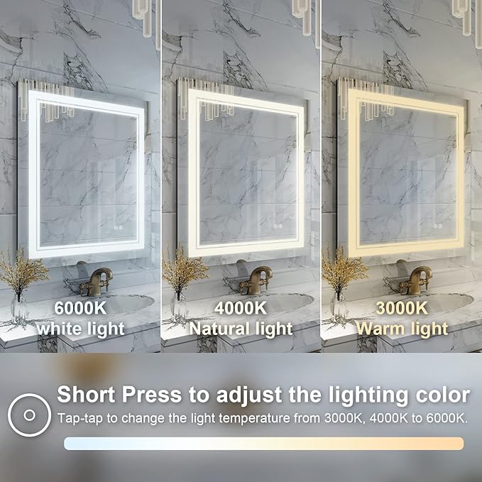 - Dimmable: Our smart vanity mirrors can adjust the color (warm, natural and white) and brightness (100%-10%) of the lights. Not only that, the lighted bathroom mirror also has a memory function. The next time you turn it on, it will keep the light color and brightness that suits you best. Perfect for hotels, high-end salons or bedrooms and bathrooms at home.