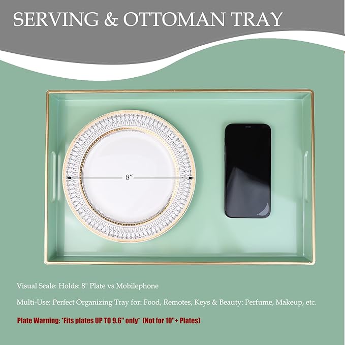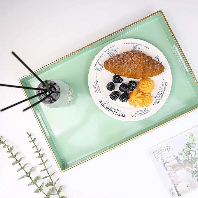 Spsyrine Green Decorative Serving Tray with Handles, Elegant Plastic Coffee Table Tray for Ottoman, Living Room, Home Decor 15.6" X 10.2"