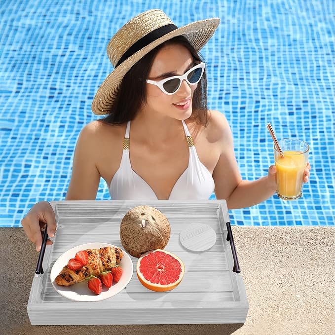 - BEAUTIFUL HANDCRAFTED DESIGN – Carefully crafted from premium quality fir wood with fine attention to details, our wooden serving tray set or tray for ottoman coffee table has ergonomically fitted metal handles for ease of carrying. Measuring 17”x 13”, this wood serving tray (rectangle) is the ideal size to carry snacks, drinks, and meals around the house without any hassle - WONDERFUL home decor!