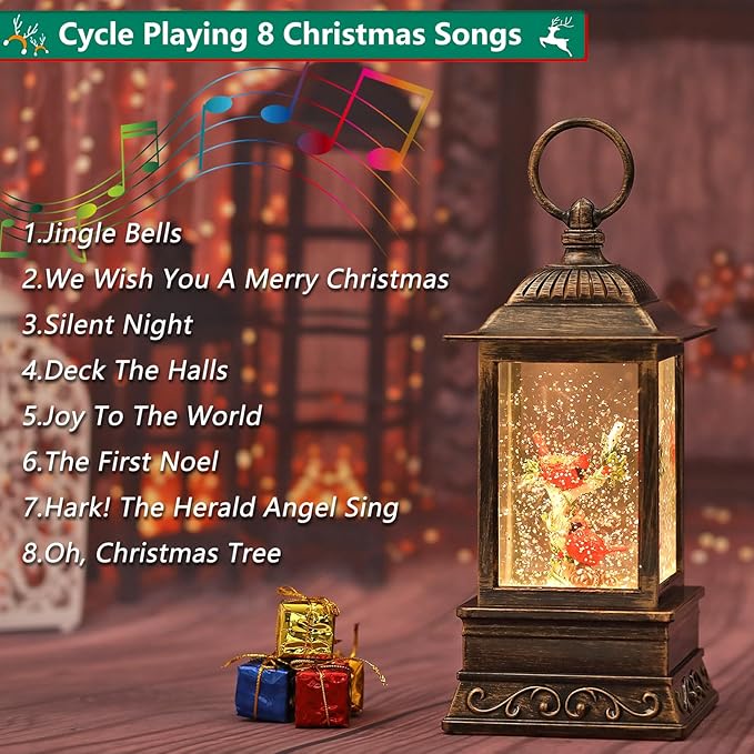 - Nice Christmas Decor: No one can say no to such a Christmas snow globes that gives a soft light and plays beautiful music! Moreover, we provide exquisite packaging. It is a sweet Christmas decorations to be given to your friends or families. The cardinal and withered tree in the soft light, while the glittering sequins are constantly rotating, create a fairytale Christmas atmosphere, which is so Eye-Catching