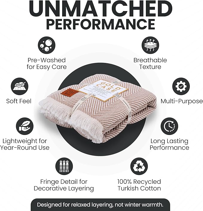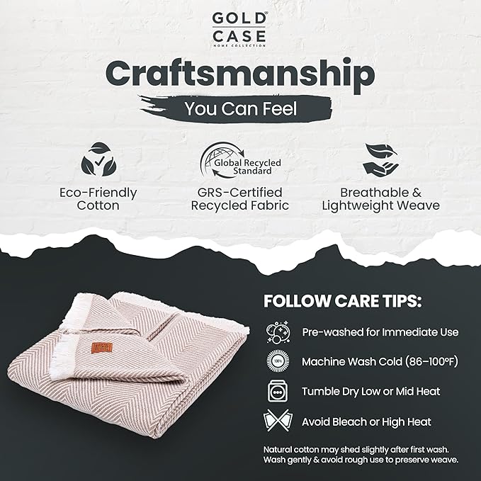 Gold Case Throw Blanket for Couch – 100% Recycled Turkish Cotton Blankets & Throws – Elegant Decorative Throw Blankets for Living Room Sofa – Woven Throws for Couch – Elegant Beige – 60x80