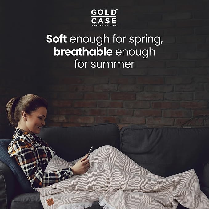 Gold Case Throw Blanket for Couch – 100% Recycled Turkish Cotton Blankets & Throws – Elegant Decorative Throw Blankets for Living Room Sofa – Woven Throws for Couch – Elegant Beige – 50x60