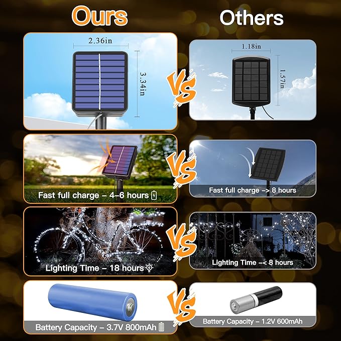 - 【Fast Charging Long Lasting】The outdoor string lights equipped with an 800mAh rechargeable battery that can be quickly fully charged within 6 hours. Once charged, the lights can shine for about 18 hours. The lights are also equipped with a built-in sensor that automatically turns them on at dusk and off at dawn, making them more efficient and convenient to use
