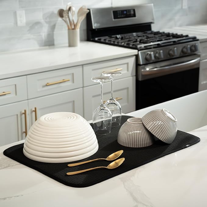 - Dish drying mats for kitchen counter are reusable, machine washable, and easy to store for kitchen organization; durable construction will not chip or break like a stone dish drying mat for kitchen