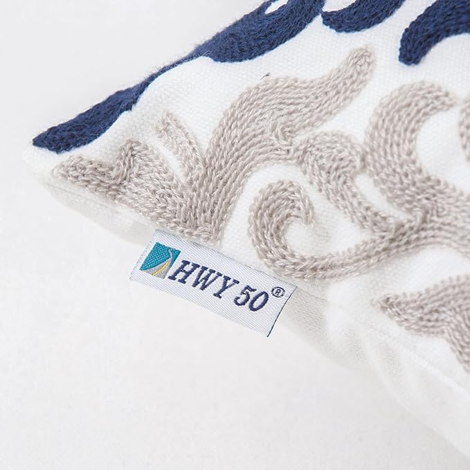 HWY 50 Navy Blue Decorative Throw Pillow Covers 18x18 Inch, Pack of 2 Embroidered Cotton Farmhouse Cushion Cover Pillow Case for Sofa Couch Living Room Bed Bedroon, Accent Geometric