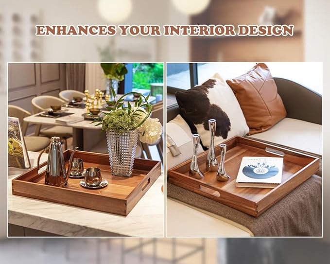 - 【HASSLE-FREE SQUARE SERVING TRAY】The built-in integrated handle of wooden tray for ottoman is easy to carry and use. Big ottoman trays has extra high surrounding tray lips that prevent items from falling over. Leak-free bottom prevents drinks from spilling out, adding convenience to serving big jobs.