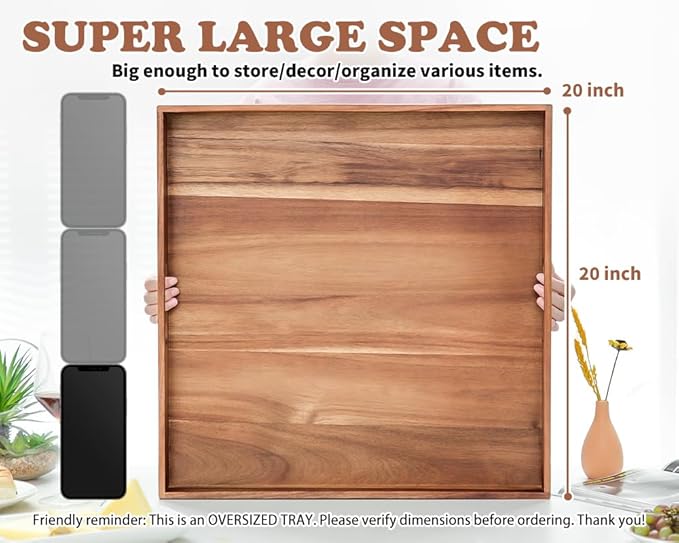 Large Ottoman Tray for Living Room, 20" Extra Large Tray for Ottoman Square Acacia Serving Trays with Handles for Coffee Table, Breakfast, Appetizers, Dinner