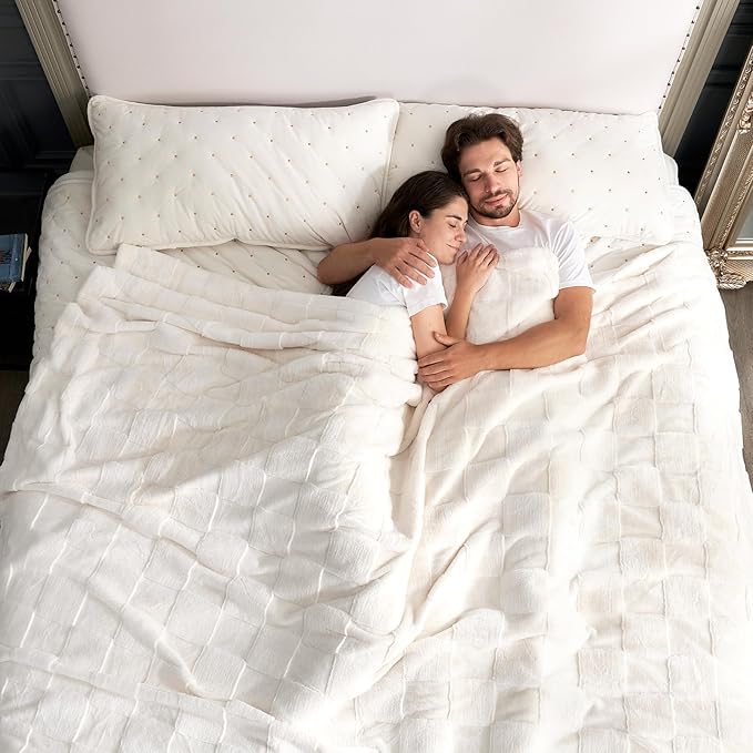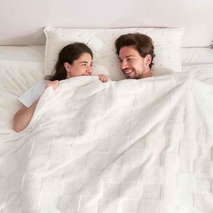 Cozy Bliss Checkered White Large Faux Rabbit Fur California King Size Bed Blanket, Soft Fuzzy Fluffy Minky Cream Furry Blankets for Couch, Bed (90 * 108 Inches Ivory)