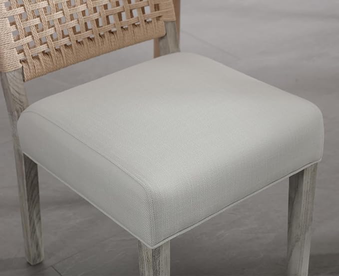 - The kitchen chair is made of high-quality materials to ensure durability and stability. The frame is made of solid pine wood, which is strong and sturdy enough to support up to 330 lbs. The seat and backrest are made of high-quality woven linen cord , which is weather-resistant and easy to clean