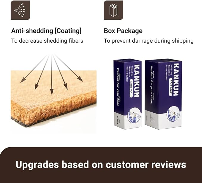 - Coco Coir Doormat : KANKUN welcome door mats are made of 100% coconut coir, which is one of the strongest natural fibers in the world. Natural coconut coir durable bristles are very effective in scraping dirt, mud and debris right at the doorstep.