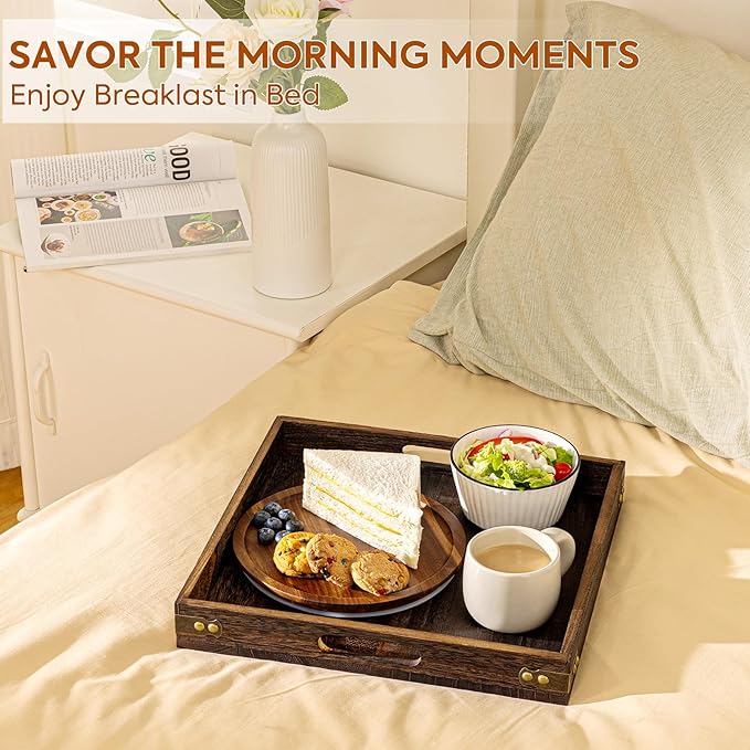 Yangbaga Serving Tray with Handles,12.5"*12.5"Wood Decorative Tray for Living Room,Modern Coffee Table Tray,Square Large Serving Platters for Home Decor,Ottoman,Bed,Kitchen,Bathroom, Breakfast,Bar