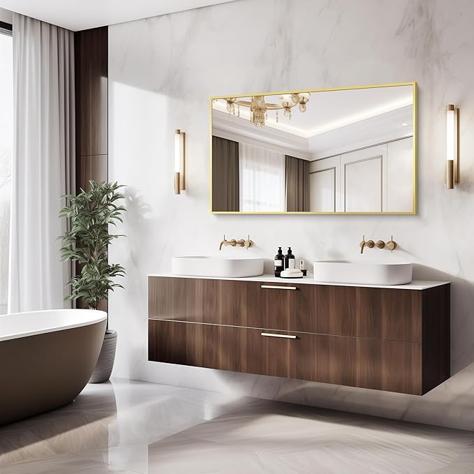 - MULTI-SCENES: Large bathroom mirror is the ideal size to place above the bathroom sink, thin frame will make your whole room unique and elegant, brushed gold bathroom mirror is a good choice to decorate your bedroom, living room, hair salon, etc.