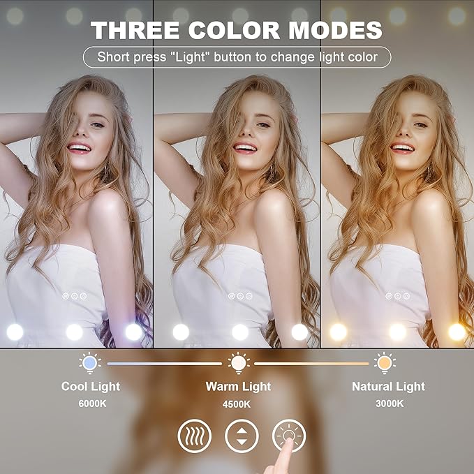 - 【3CCT and Brightness Adjustment】 This LED bathroom mirror offers 3000K (warm light), 4500K (natural light), and 6000K (cool light). Short press the button to switch modes, and long press to adjust brightness. The memory function saves your last settings, eliminating the need for readjustment.