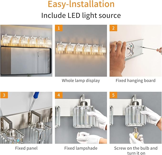 - 【Easy Installation】This is designed for US standard junction box, no complicated installation procedure is needed. All required parts are included in the package with additional replacement crystal strips. Note: For your safety, please install the vanity light under the guidance of an electrician.