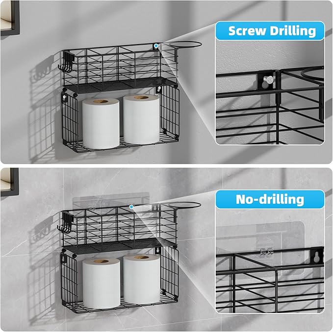 VITVITI Metal Hair Tool Organizer with Toilet Paper Basket, Bathroom Blow Dryer Curling Iron Holder Wall Mount, 2 Tiers Styling Tools Organizer for Straightener with Hooks, Black
