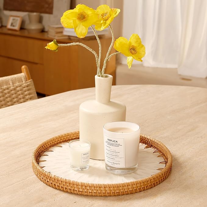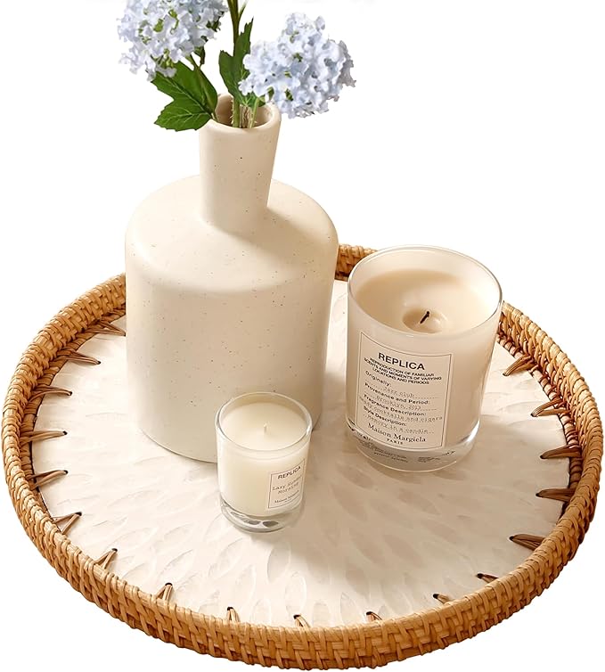 - Natural Rattan and Seashell Design: This tray is crafted from high-quality natural rattan, handwoven with beautiful seashell inlays at the base, showcasing a blend of natural materials and artistic craftsmanship