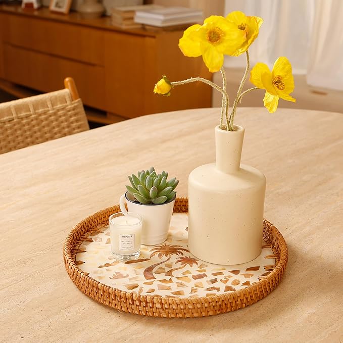 Round Rattan Tray with Mother of Pearl Inlay & Wooden Base - Decorative Wicker Serving Tray for Coffee/Bread/Fruits, Food Storage & Display - Multipurpose Home Decor (M,Island)