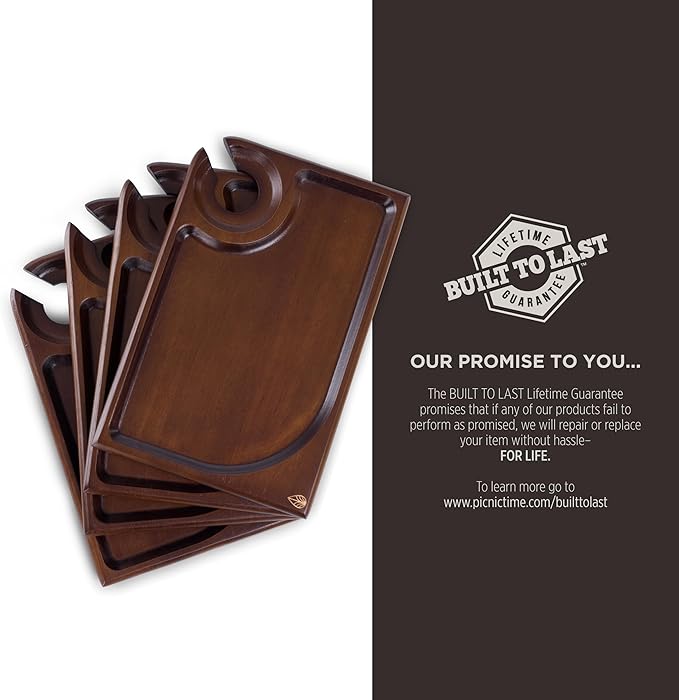PICNIC TIME Rectangle Wine Appetizer Plates Set of 4, Cocktail Plate with Glass Holder, Cheese Board with Wine Holder, (Stained Parawood)