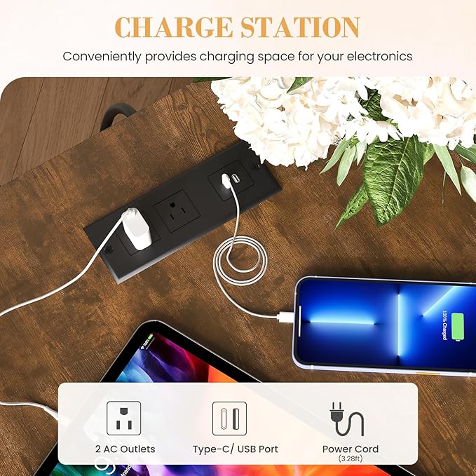 - Built-In Charging Station for Convenience: Stay powered up with the integrated charging hub: 2 AC outlets, 1 USB port and 1 Type C port of bedside table let you charge phones, tablets, lamps, and more simultaneously. Keep cables of small desk tidy and devices of end tables living room within reach—no more scrambling for adapters or sacrificing bedside space to clutter