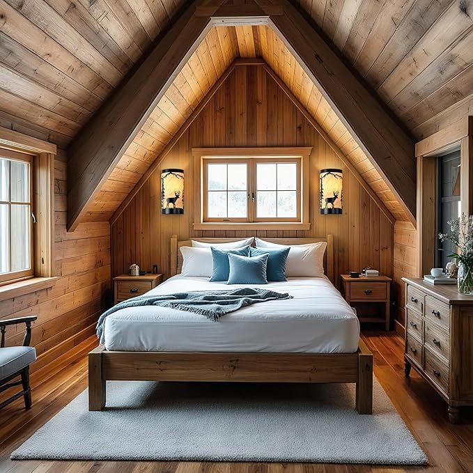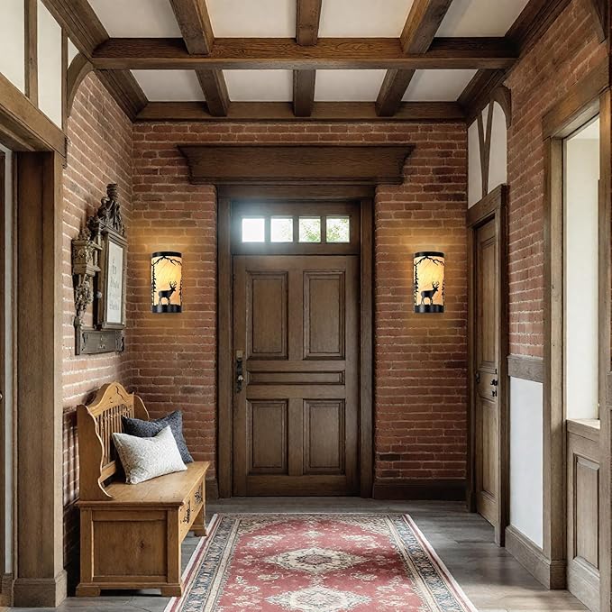 - Rustic Design: Farmhouse wall sconces set of two is crafted from durable matte black metal,featuring intricate forest elements and a deer silhouette,yellow parchment paper adds a soft,warm glow,enhancing industrial aesthetic of the black wall sconce