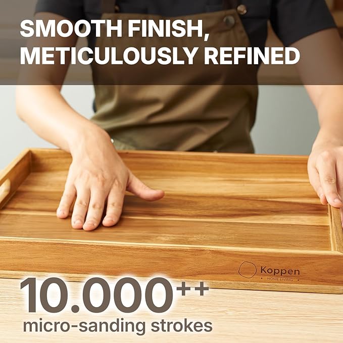 - [METICULOUSLY REFINED]: Our wooden serving tray is hand-finished through over 10,000 micro-sanding strokes—leaving the surface irresistibly soft, almost mental-like to the touch. Perfect as a wooden decorative tray, rectangle tray, or coffee tray for tray decor, it elevates food trays for eating, bed food trays for adults, serving platters and trays for parties, or party serving trays and platters.