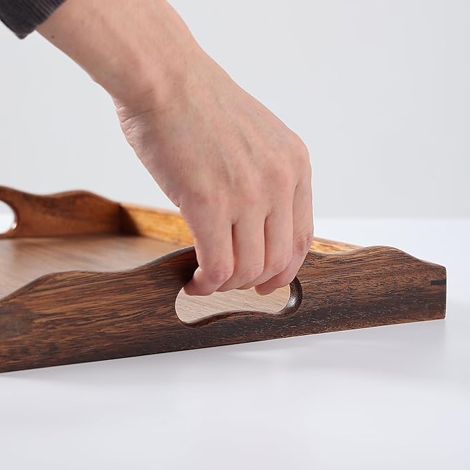 - Elegant South American walnut wooden serving tray, crafted from all solid wood for durability and a natural aesthetic. Perfect as a kitchen tray for counter use or a decorative wood tray in any room. Features ergonomic handles (16.6x11.8x2.4in) for easy carrying