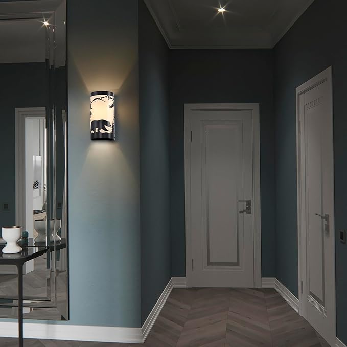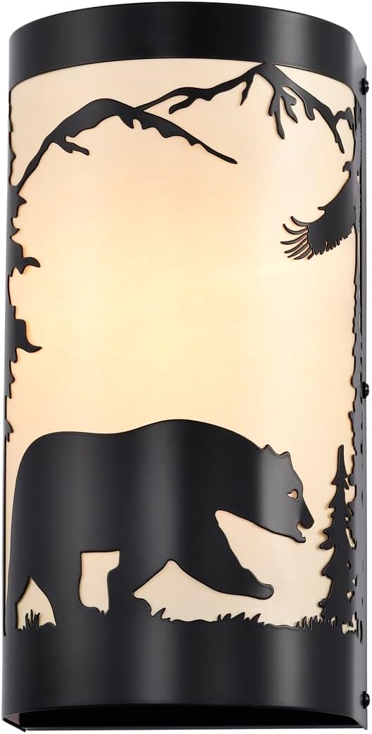 - Rustic Design: Black wall sconces is crafted from durable matte black metal,featuring intricate forest elements and a bear silhouette,white parchment paper adds a soft,warm glow,enhancing industrial aesthetic of the vintage wall sconce