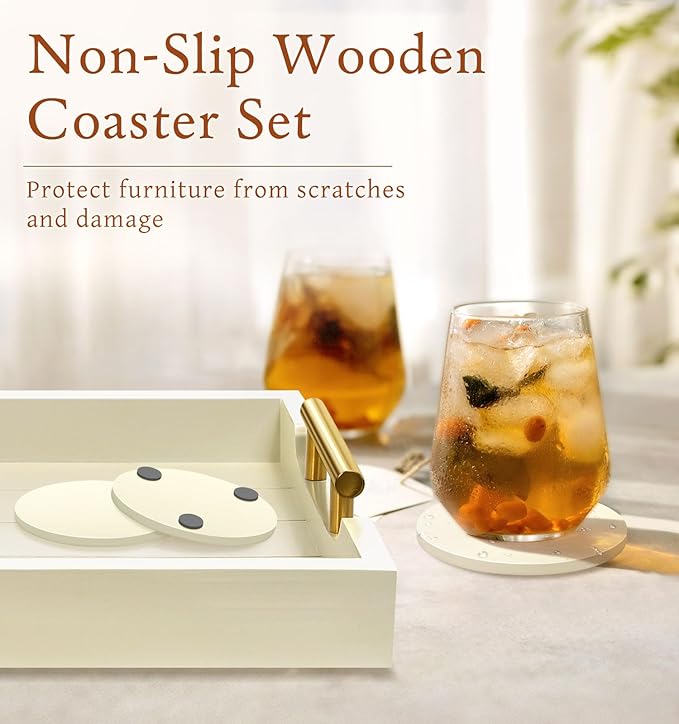 Coffee Table Tray - Large Ottoman Tray for Living Room - Wood Serving Trays with Handles(2 Sets) - Wooden Trays for Coffee Table, 4 Round Coasters Included, Off-White