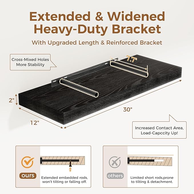 Fun Memories Black Floating Shelves 30" W x 12" D, 12 Inch Deep Floating Shelf for Books, Bathroom, Living Room, Rustic Wood Wall Shelves, 2 Inch Thicked Storage Shelf for Home Storage, Set of 2