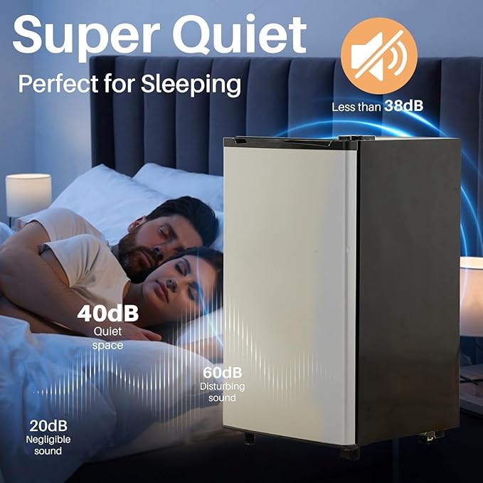 - 🔇 Quiet and Functional Design: Operating at a whisper-quiet noise level of 38 dB, the compact refrigerator is perfect for environments requiring minimal noise, such as bedrooms or shared office spaces.